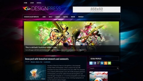 DesignPress is a free blogger template adapted from WordPress with 2 columns, responsive design, right sidebar, fresh look, ads ready, footer columns, slider, social bookmarking icons, posts thumbnails, tabs, abstract, geometric motifs and gradients.Excellent template for blogs about art, fantasy, fashion, movies or music.