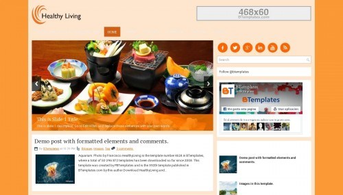 HealthyLiving is a free blogger template adapted from WordPress with 2 columns, responsive design, right sidebar, fresh look, ads ready, footer columns, slider, social bookmarking icons, posts thumbnails, related posts support and simple look.Excellent template for blogs about food, health and beauty or nature.