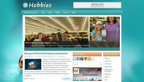 Hobbies is a free blogger template adapted from WordPresswith 3 columns, responsive design, right sidebar, fresh look, ads ready, footer columns, slider, social bookmarking icons, posts thumbnails and tabs.Excellent template for blogs about crafts or nature.
